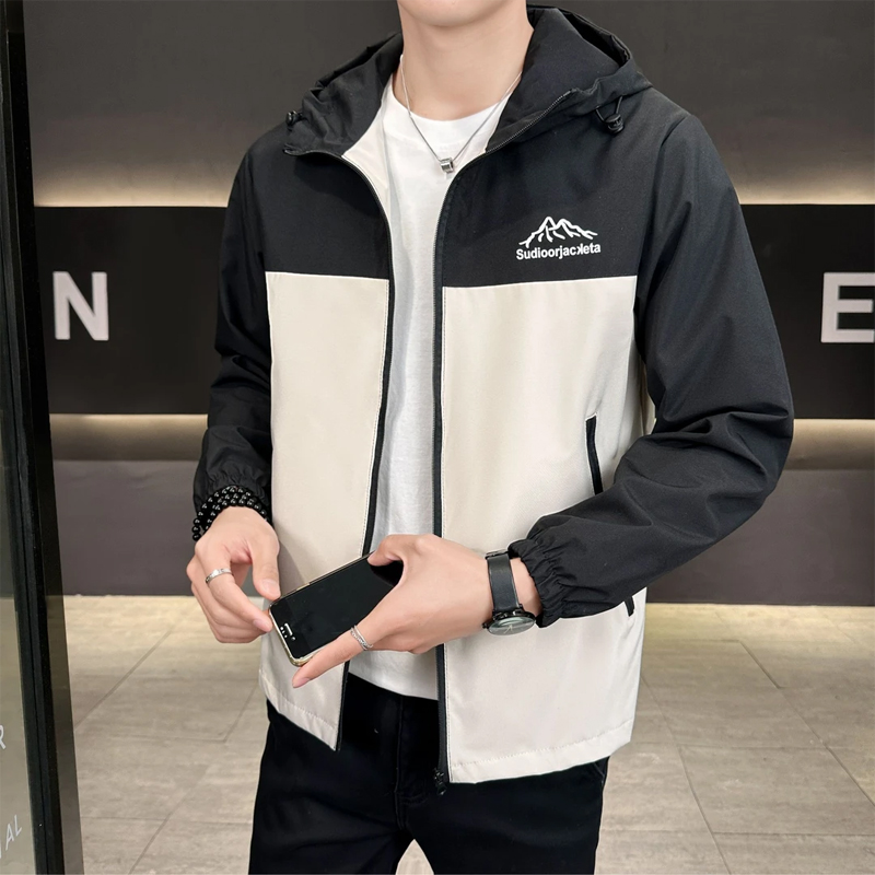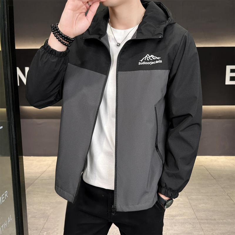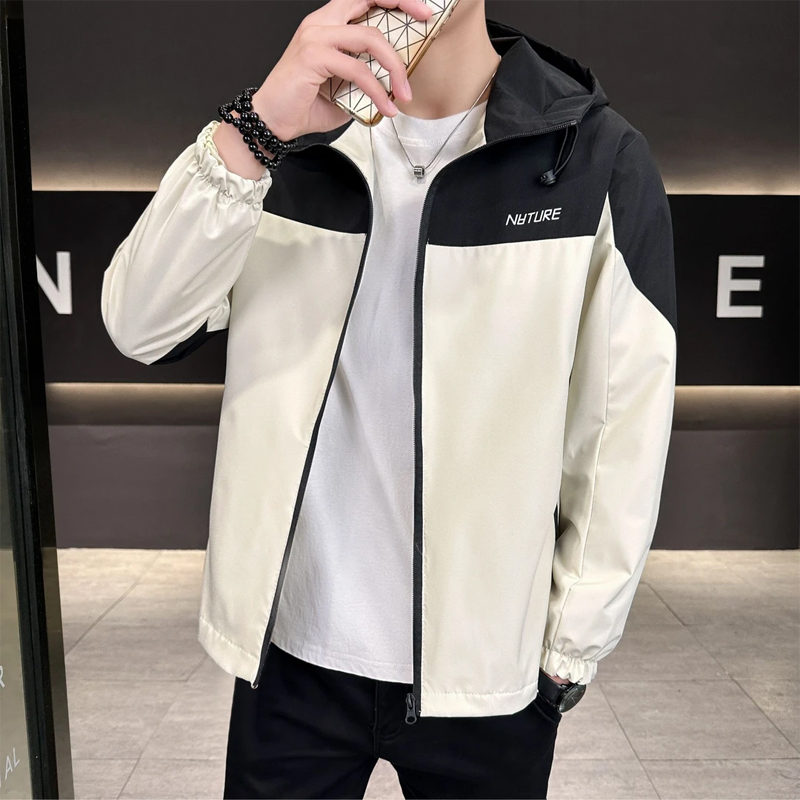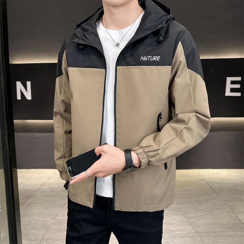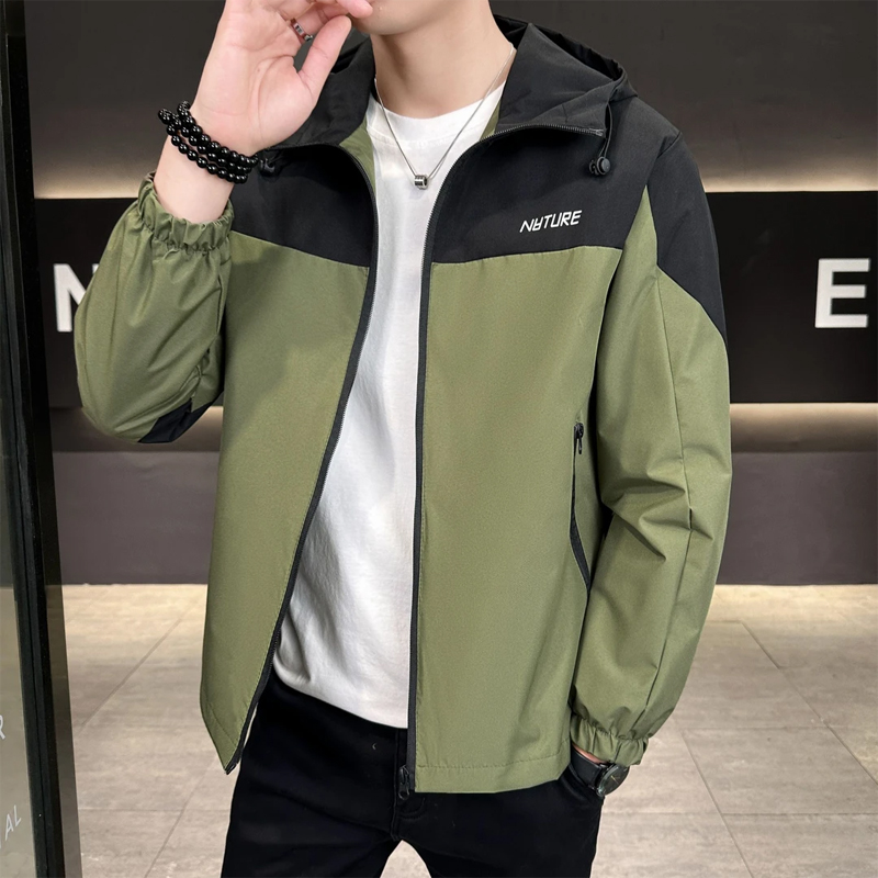 > 春秋男士外套潮流休闲夹克连帽青少年学生冲锋衣薄款宽松男装褂子