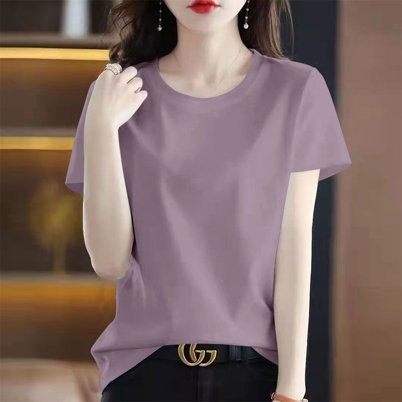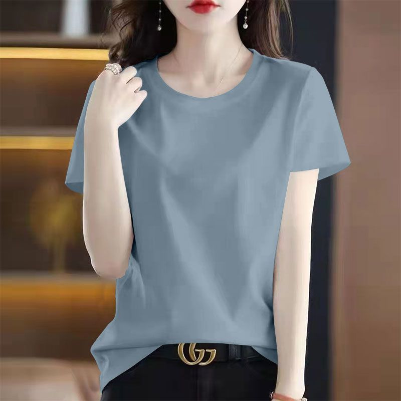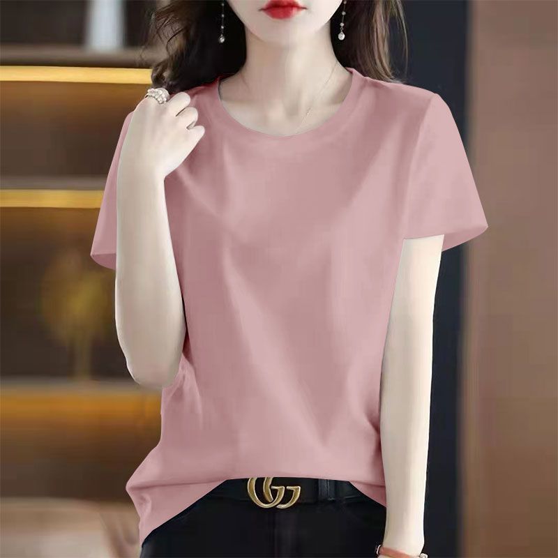 > 100%纯棉纯色短袖圆领T恤女夏季新款韩版宽松显瘦印花休闲上衣服