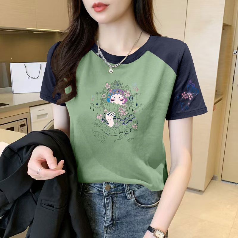 潮流撞色插肩袖短袖纯棉t恤女圆领时尚夏季新款印花ins大码上衣服