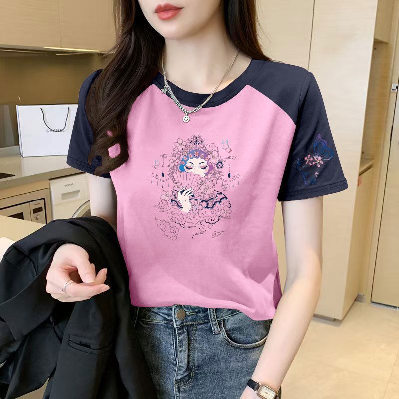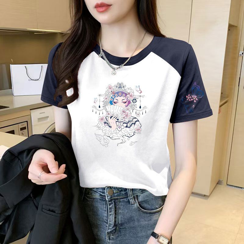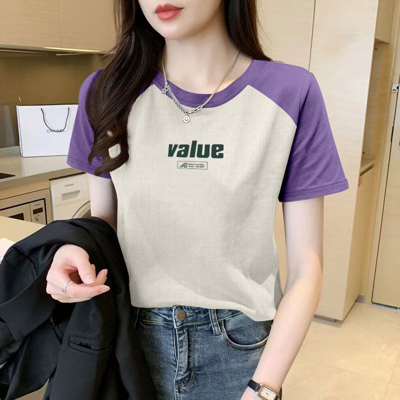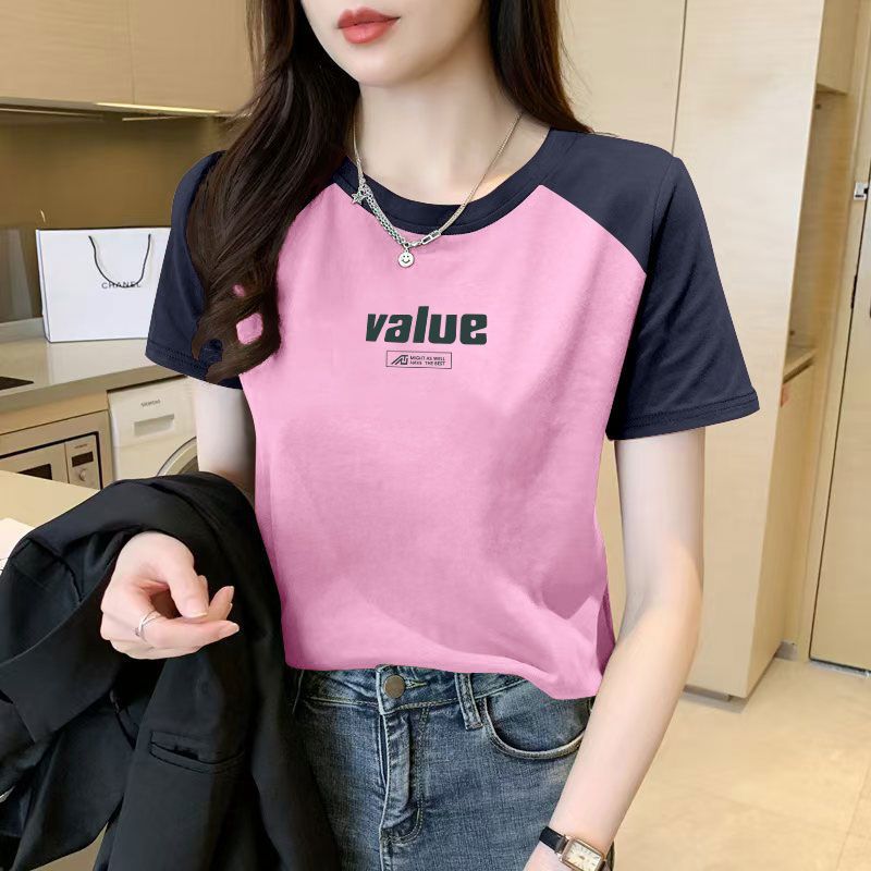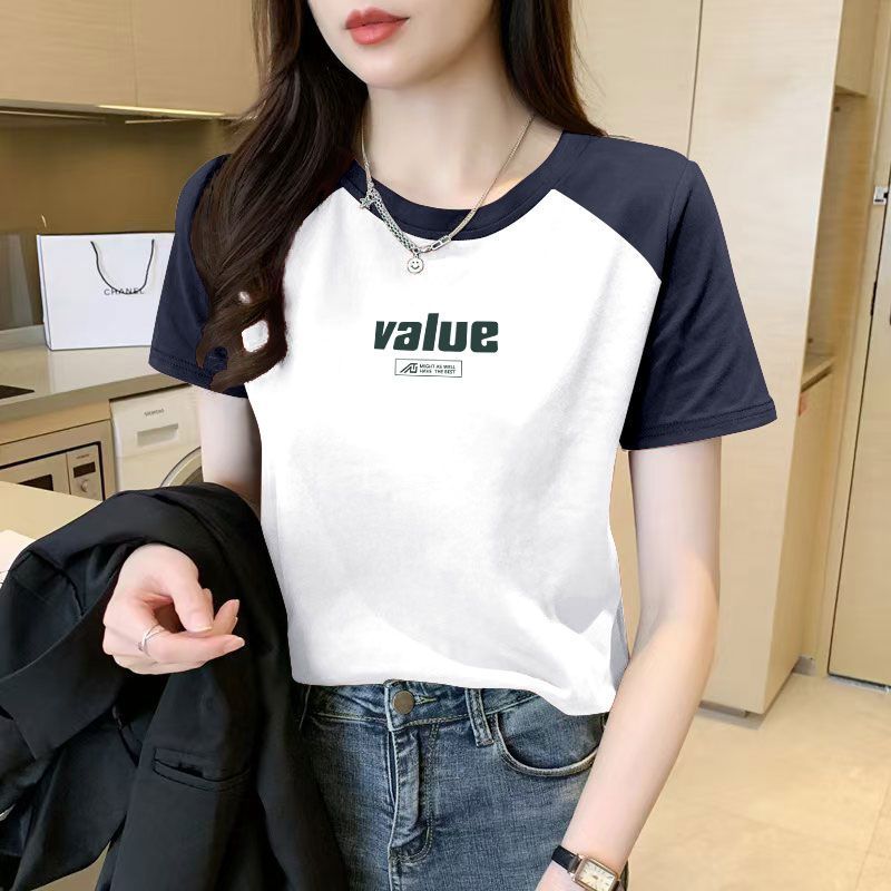 > 潮流撞色插肩袖短袖纯棉t恤女圆领时尚夏季新款印花ins大码上衣服
